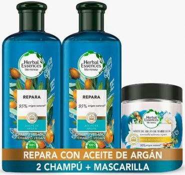 🎯 Solo hoy en oferta flash tienes el pack Herbal Essences, repara con aceite de argán, que incluye 2 champú y una mascarilla